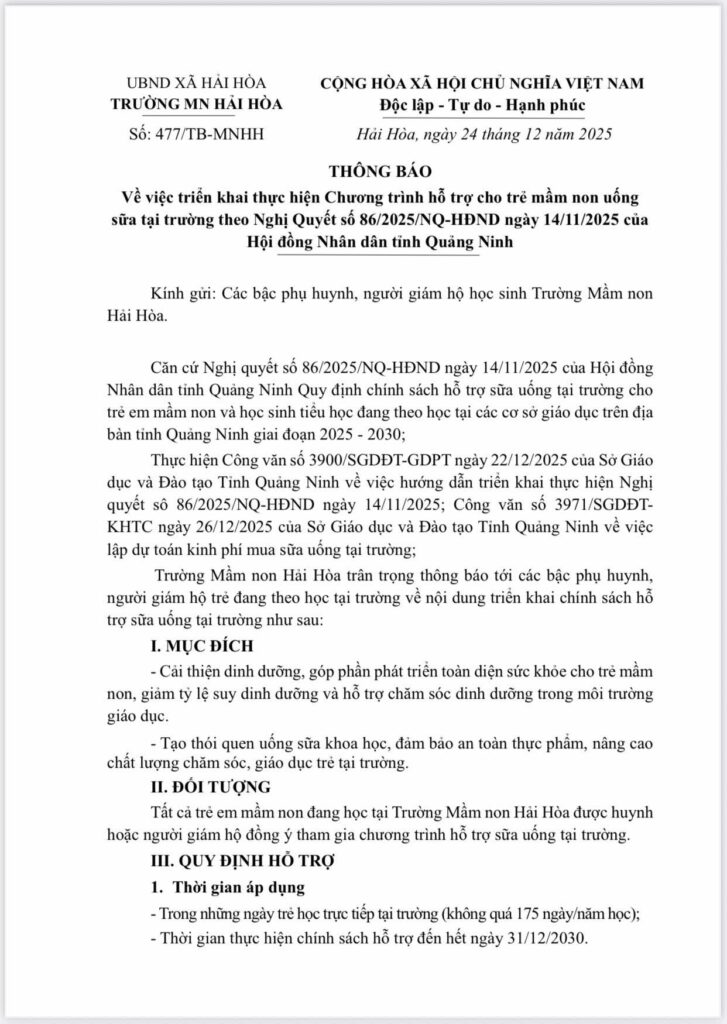 🌸🌸‘’Nghị quyết số 86/2025/NQ-HĐND ngày 14/11/2025 của Hội đồng nhân dân tỉnh Quảng Ninh Quy định chính sách hỗ trợ sữa uống tại trường cho trẻ em mầm non, học sinh tiểu học đang học tại các cơ sở giáo dục trên địa bàn tỉnh Quảng Ninh giai đoạn 2025 – 2030″